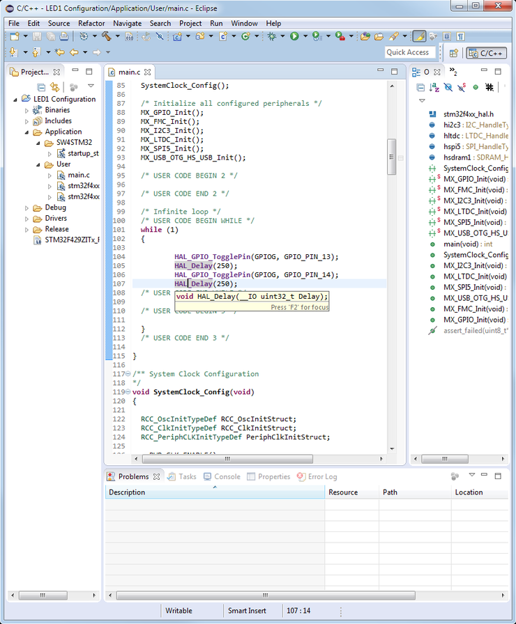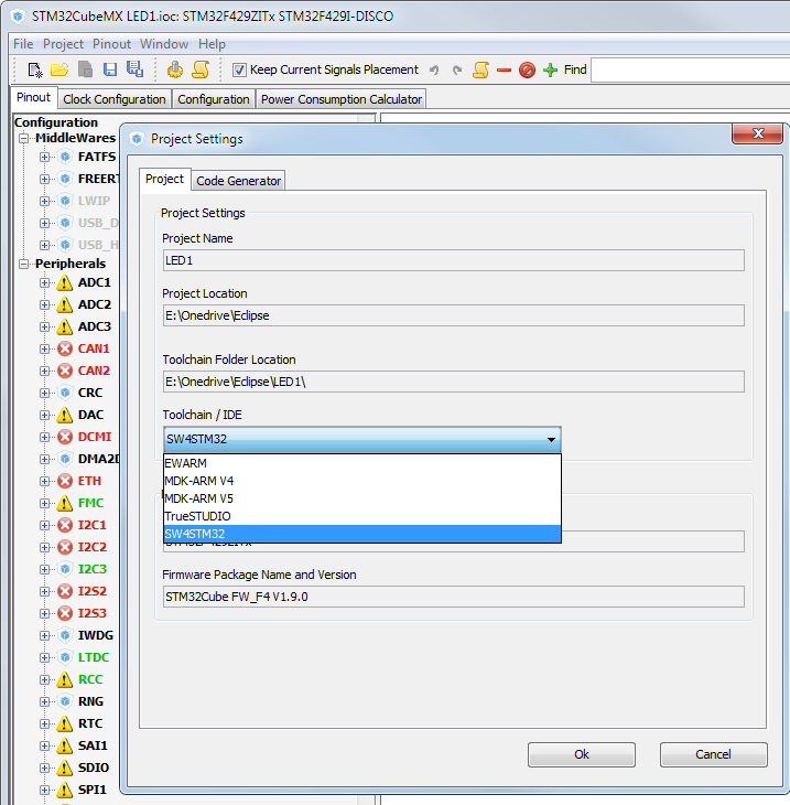 STM32CubeMX는 IAR Embedded Workbench for ARM(EWARM), Keil uVision(MDK-ARM), Atollic TrueSTUDIO, 그리고 System Workbench for STM32(SW4STM32) IDE에서 인식하는 코드만 만들어냅니다. 처음 세 프로그램은 비싼 돈을 지불해야 크기제한이 없는 hex파일을 만들 수 있어요. 크기제한이 없는 hex파일을 무료로 만들 수 있는 IDE중 STM32CubeMX가 지원하는 유일한 IDE가 SW4STM32여서, SW4STM32 IDE를 사용하기로 했습니다.