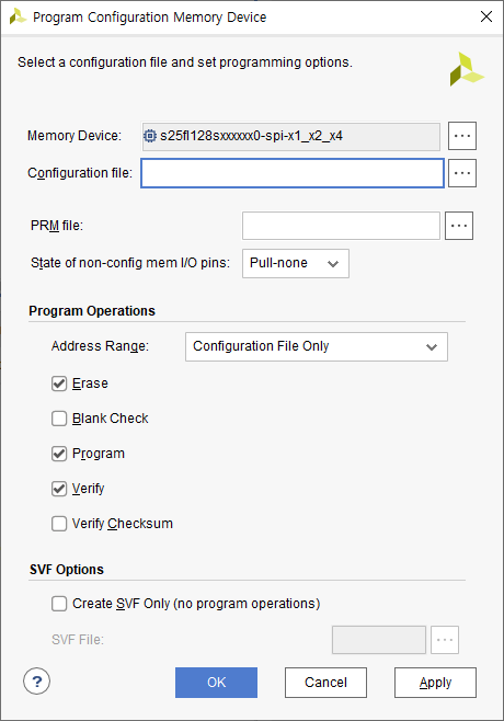 ** 만약 메모리가 선택되어 있지않다면 Add Configuration Memory Device를