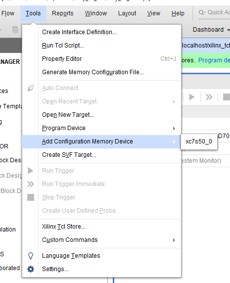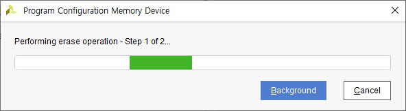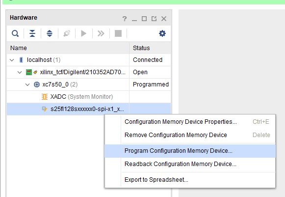 Flow Navigator 창에서 PROGRAM AND DEBUG 선택 -> Hardware Window에서 Memory 마우스 우클릭 -> Program Configuration Memory Device... 클릭