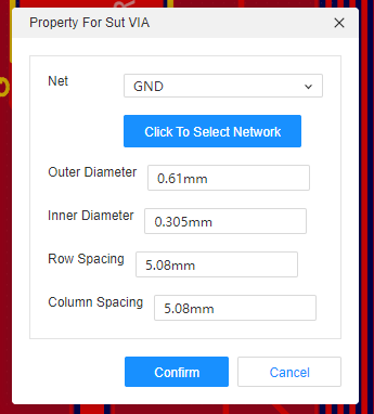 팝업 창이 뜨면 생성되는 Via 에 연결할 Net 를 지정해야함