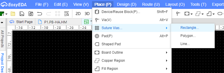 Place → Shuture Vias... → 영역 선택 방식 (본인은 사각으로 주로 지정함)